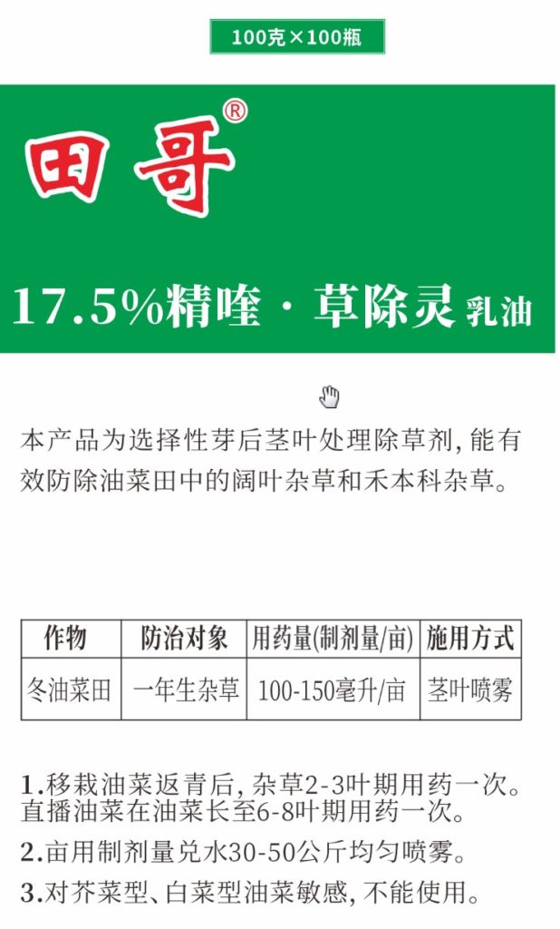 [使用技術(shù)要求]1.移栽油菜返青后,雜草2—3葉期用藥一次。直播油菜在油菜長至6—8葉期用藥一次。2.畝用制劑量兌水30—50公斤均勻噴霧。3.對芥菜型、白菜型油菜敏感,不能使用。4.油菜每個生長周期最多使用1次。